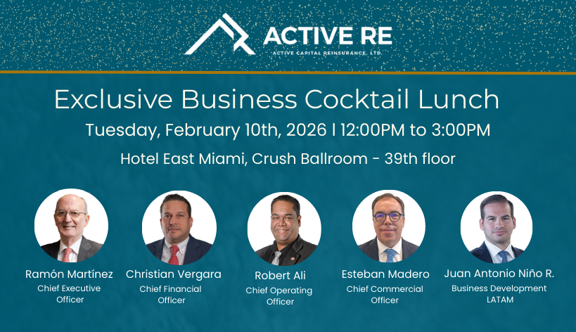 During Miami Reinsurance Week 2026, Active Re will host its 4th Exclusive Business Cocktail Lunch, an invitation-only gathering designed to foster high-level reinsurance dialogue, networking, and meaningful connections, while strengthening relationships with cedents, brokers, and strategic partners from the region.
