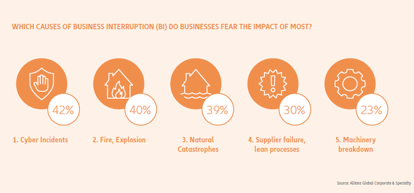 Business interruption (BI), including supply chain disruption, is the top risk for companies for the sixth consecutive year, according to the Allianz Risk Barometer 2018, with 42% of responses rating it as one of the three most important risks in 2018. Whether it results from factory fires, destroyed shipping containers, or increasingly, non-physical damage risks like cyber, political violence, product recall or similar incidents, BI has tremendous effects on revenue.